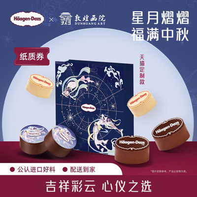 哈根达斯月光宝盒定制款月饼,礼盒内含曲奇香奶味、草莓味2枚、经典牛乳味2枚组合月饼,设计绝对用心,送礼体面上档次。星盘点亮团圆重逢,吉祥彩云心仪之选;飞天造型印花,增添古典异域风雅~中秋礼盒送点不一样的~