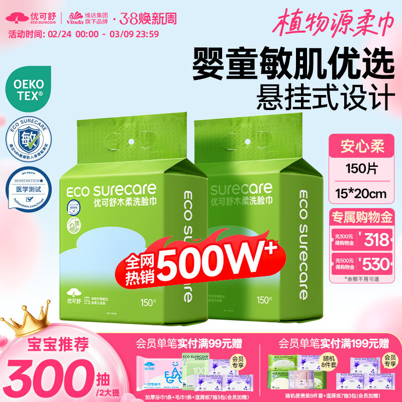优可舒家庭装悬挂壁挂式洗脸巾150抽 立减+券后9.9元包邮